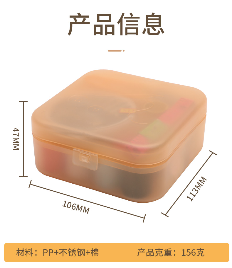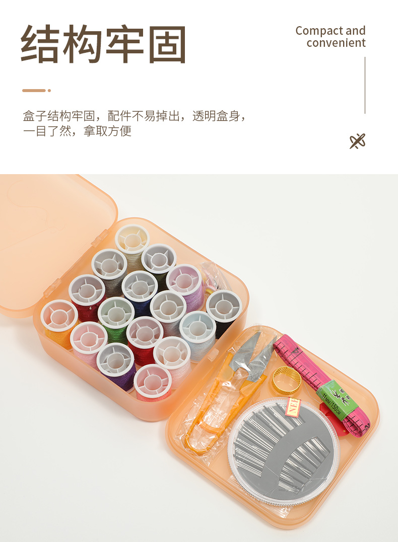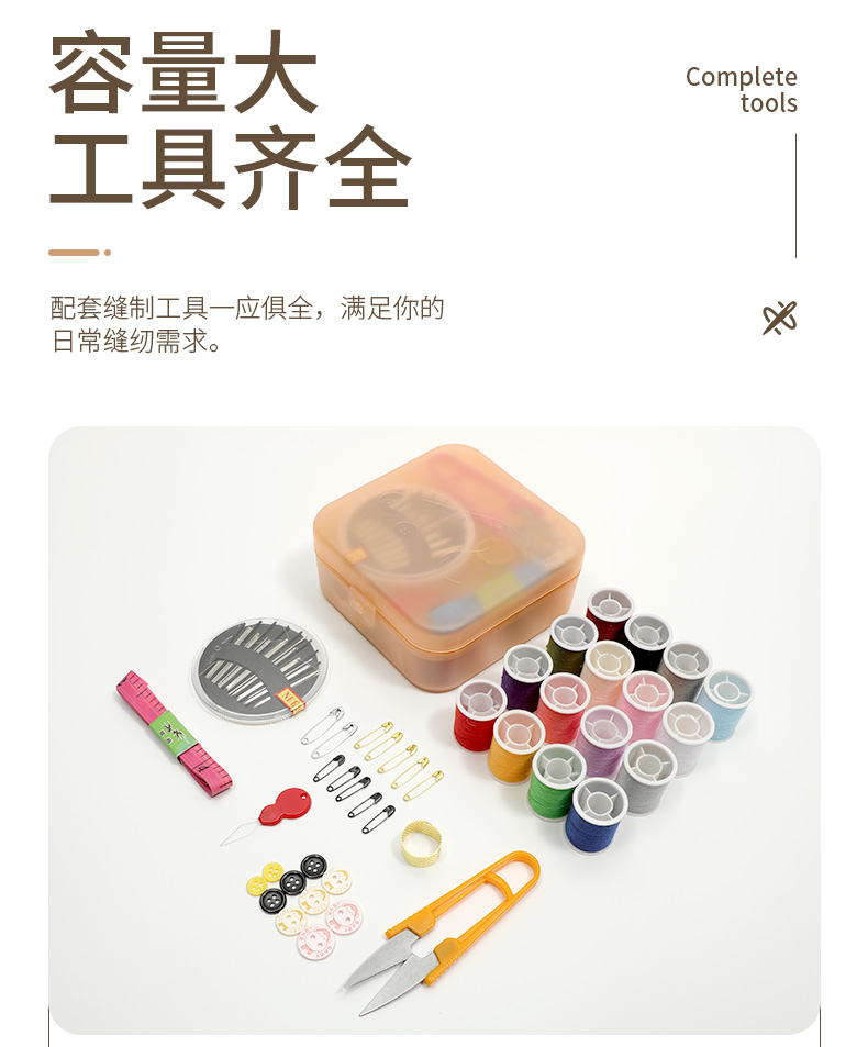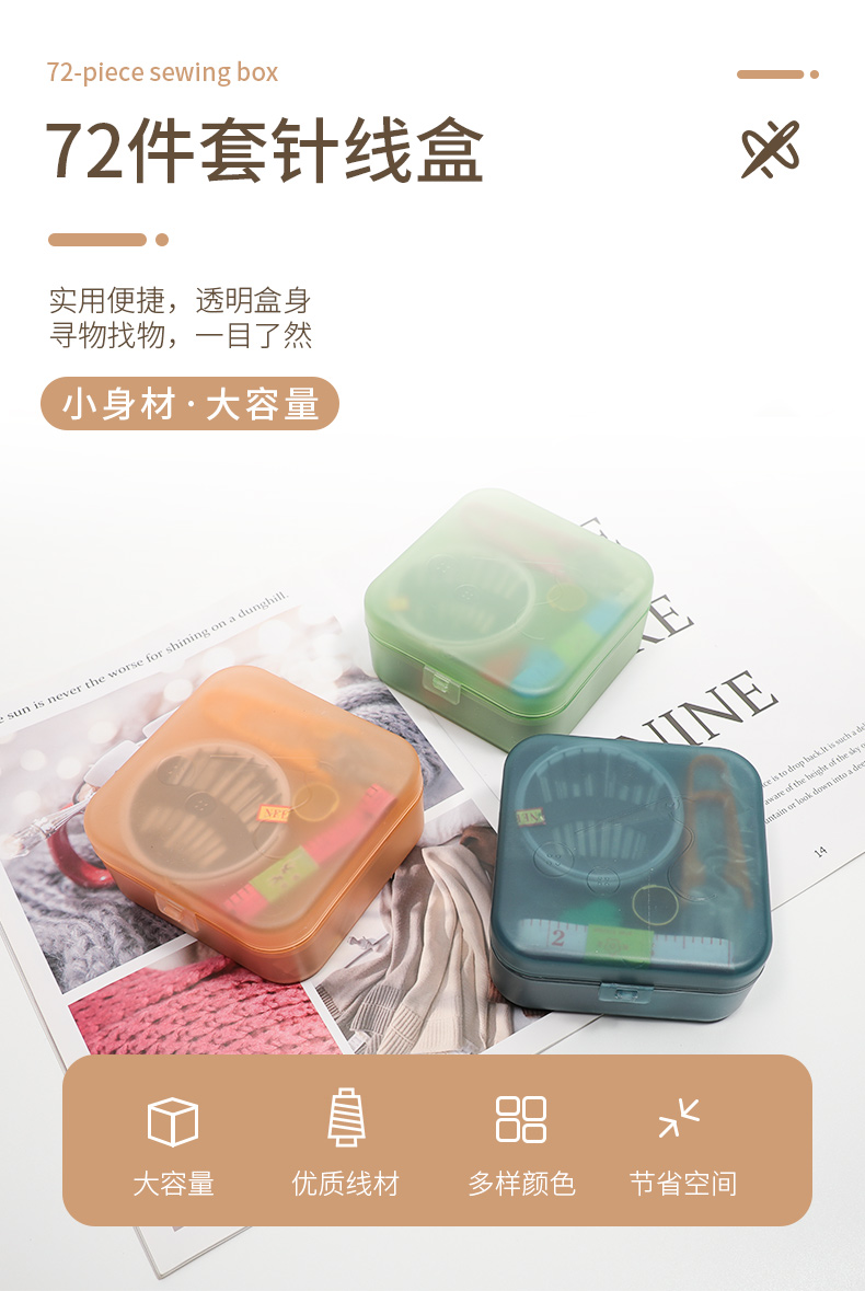 72pc針線包裝盒設計簡潔、使用功能齊全、攜帶方便的理念,內置手縫針、拆線刀、皮尺、鈕扣、別針、縫紉線等物品。